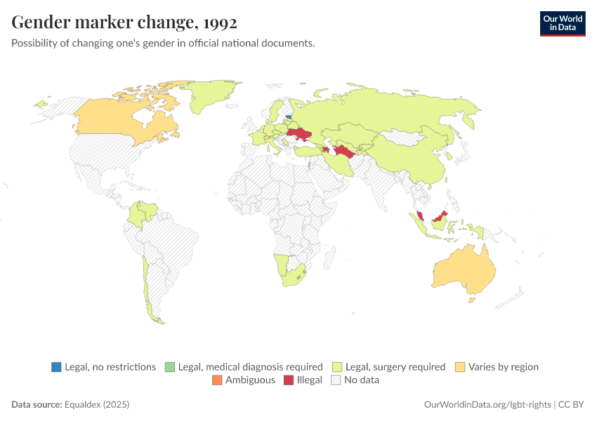 “Data Page: Gender marker change”, part of the following publication: Bastian Herre and Pablo Arriagada (2023) - “LGBT+ Rights”. Data adapted from Equaldex. Retrieved from https://tag-updates.owid.pages.dev:8789/20250909-093708/grapher/right-to-change-legal-gender-equaldex.html [online resource] (archived on September 9, 2025).How to cite this data