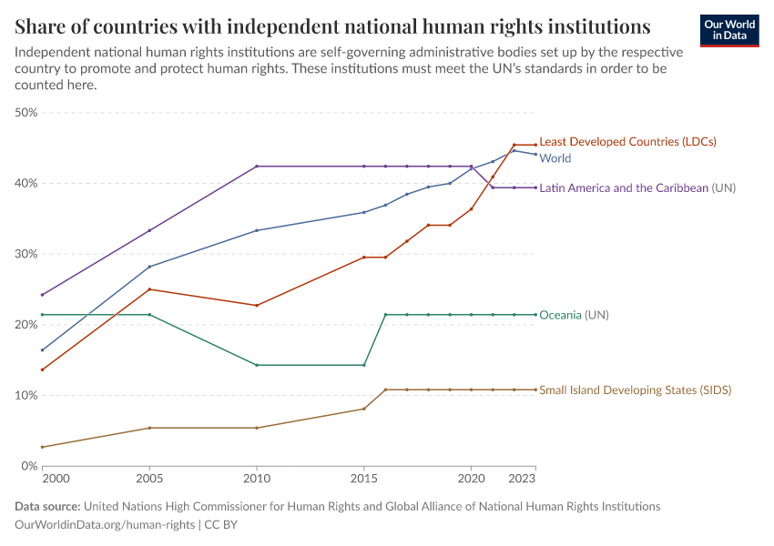 United Nations High Commissioner for Human Rights and Global Alliance of National Human Rights Institutions – with minor processing by Our World in Data. “Share of countries with independent national human rights institutions” [dataset]. United Nations High Commissioner for Human Rights and Global Alliance of National Human Rights Institutions, “Source: The Office of the United Nations High Commissioner for Human Rights (OHCHR) in collaboration with Global Alliance of National Human Rights Institutions (GANHRI).” [original data]. Retrieved February 27, 2026 from https://tag-updates.owid.pages.dev:8789/20260130-180113/grapher/share-countries-accredited-independent-national-human-rights-institutions.html (archived on January 30, 2026).