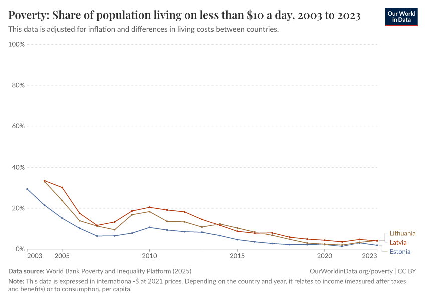 “Data Page: Poverty: Share of population living on less than $10 a day”, part of the following publication: Joe Hasell, Bertha Rohenkohl, Pablo Arriagada, Esteban Ortiz-Ospina, and Max Roser (2022) - “Poverty”. Data adapted from World Bank Poverty and Inequality Platform. Retrieved from https://tag-updates.owid.pages.dev:8789/20260127-114142/grapher/share-living-with-less-than-10-int--per-day.html [online resource] (archived on January 27, 2026).How to cite this data