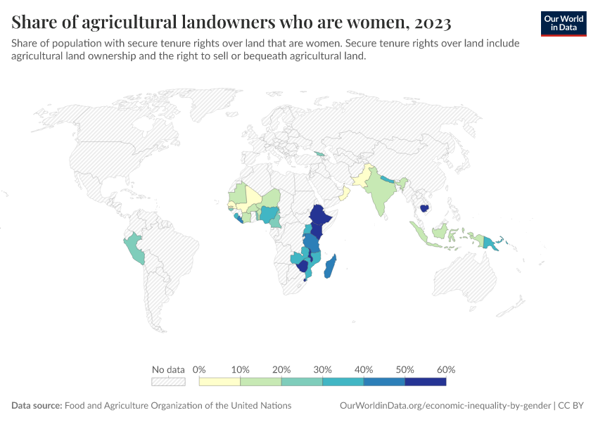 “Data Page: Share of agricultural landowners who are women”, part of the following publication: Hannah Ritchie, Pablo Rosado, and Max Roser (2023) - “Agricultural Production”. Data adapted from Food and Agriculture Organization of the United Nations. Retrieved from https://tag-updates.owid.pages.dev:8789/20260105-133053/grapher/share-of-agricultural-land-owners-that-are-women.html [online resource] (archived on January 5, 2026).How to cite this data