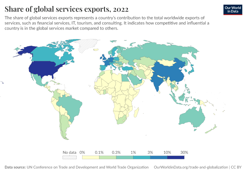 UN Conference on Trade and Development and World Trade Organization – with minor processing by Our World in Data. “Share of global services exports” [dataset]. UN Conference on Trade and Development and World Trade Organization, “UNCTADstat. Data compiled by UNCTAD and WTO.” [original data]. Retrieved February 27, 2026 from https://tag-updates.owid.pages.dev:8789/20260130-180113/grapher/share-of-global-services-exports.html (archived on January 30, 2026).