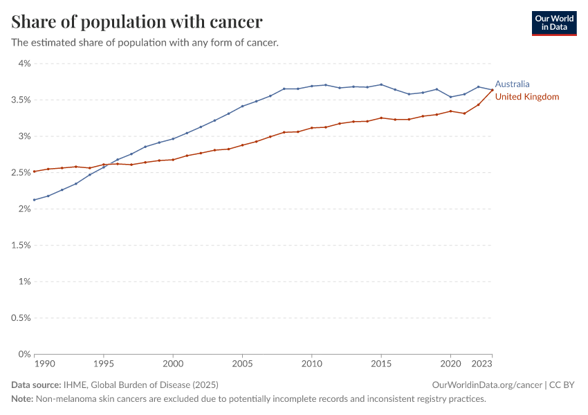 “Data Page: Share of population with cancer”, part of the following publication: Esteban Ortiz-Ospina and Max Roser (2016) - “Global Health”. Data adapted from IHME, Global Burden of Disease. Retrieved from https://tag-updates.owid.pages.dev:8789/20260212-172859/grapher/share-of-population-with-cancer-crude.html [online resource] (archived on February 12, 2026).How to cite this data
