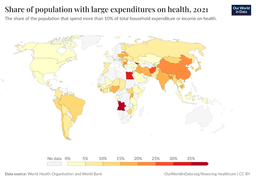 World Health Organisation and World Bank – with minor processing by Our World in Data. “Share of population with large expenditures on health” [dataset]. World Health Organisation and World Bank, “Data from multiple sources” [original data]. Retrieved February 27, 2026 from https://tag-updates.owid.pages.dev:8789/20260130-180113/grapher/share-of-population-with-large-household-expenditures-on-health-10pc.html (archived on January 30, 2026).
