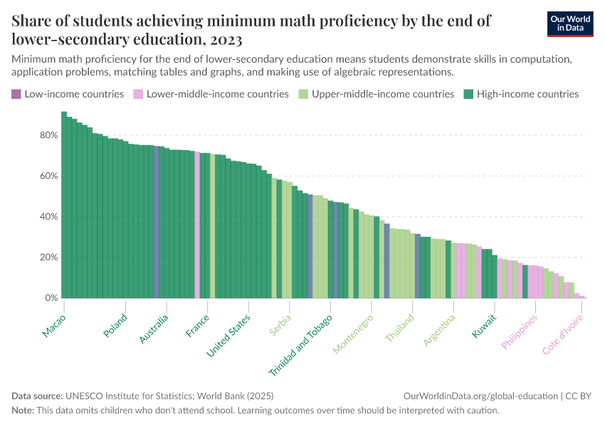 “Data Page: Share of students achieving minimum math proficiency by the end of lower-secondary education”, part of the following publication: Hannah Ritchie, Veronika Samborska, Esteban Ortiz-Ospina, and Max Roser (2023) - “Global Education”. Data adapted from UNESCO Institute for Statistics. Retrieved from https://tag-updates.owid.pages.dev:8789/20260130-180113/grapher/share-of-students-at-end-of-lower-secondary-education-achieving-minimum-math-proficiency.html [online resource] (archived on January 30, 2026).How to cite this data