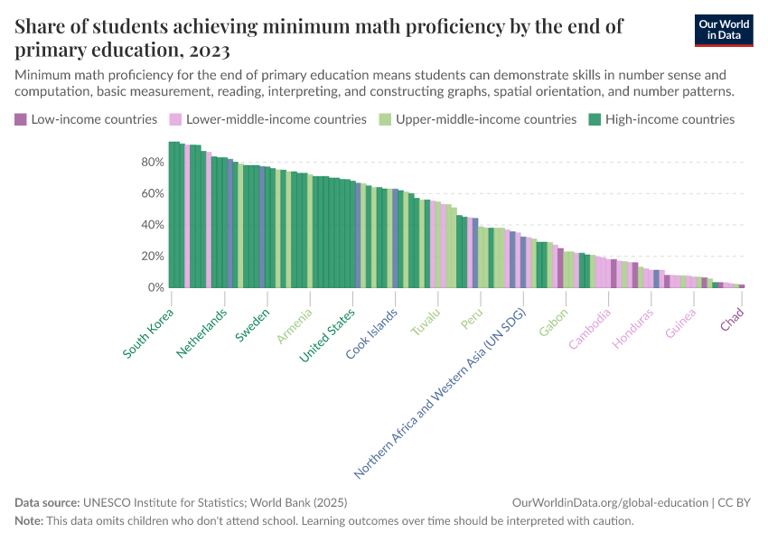 “Data Page: Share of students achieving minimum math proficiency by the end of primary education”, part of the following publication: Hannah Ritchie, Veronika Samborska, Esteban Ortiz-Ospina, and Max Roser (2023) - “Global Education”. Data adapted from UNESCO Institute for Statistics. Retrieved from https://tag-updates.owid.pages.dev:8789/20260130-180113/grapher/share-of-students-at-end-of-primary-education-achieving-minimum-math-proficiency.html [online resource] (archived on January 30, 2026).How to cite this data