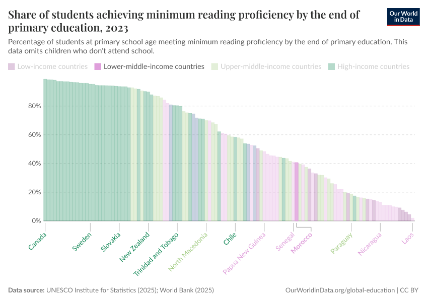 “Data Page: Share of students achieving minimum reading proficiency by the end of primary education”, part of the following publication: Hannah Ritchie, Veronika Samborska, Esteban Ortiz-Ospina, and Max Roser (2023) - “Global Education”. Data adapted from UNESCO Institute for Statistics. Retrieved from https://tag-updates.owid.pages.dev:8789/20260122-091445/grapher/share-of-students-at-end-of-primary-education-achieving-minimum-reading-proficiency.html [online resource] (archived on January 22, 2026).How to cite this data