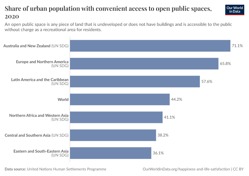 “Data Page: Share of urban population with convenient access to open public spaces”, part of the following publication: Esteban Ortiz-Ospina, Tuna Acisu, and Max Roser (2017) - “Happiness and Life Satisfaction”. Data adapted from United Nations Human Settlements Programme. Retrieved from https://tag-updates.owid.pages.dev:8789/20260130-180113/grapher/share-of-urban-population-with-convenient-access-to-open-public-spaces.html [online resource] (archived on January 30, 2026).How to cite this data