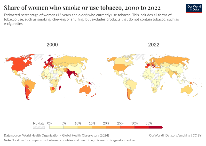 “Data Page: Share of women who smoke or use tobacco”, part of the following publication: Hannah Ritchie and Max Roser (2023) - “Smoking”. Data adapted from World Health Organization. Retrieved from https://tag-updates.owid.pages.dev:8789/20260119-065148/grapher/share-of-women-who-are-smoking.html [online resource] (archived on January 19, 2026).How to cite this data