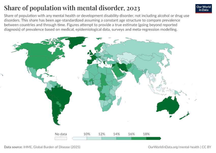 “Data Page: Share of population with mental disorder”, part of the following publication: Saloni Dattani, Lucas Rodés-Guirao, Hannah Ritchie, and Max Roser (2023) - “Mental Health”. Data adapted from IHME, Global Burden of Disease. Retrieved from https://tag-updates.owid.pages.dev:8789/20260212-100858/grapher/share-with-mental-health-or-development-disorder.html [online resource] (archived on February 12, 2026).How to cite this data