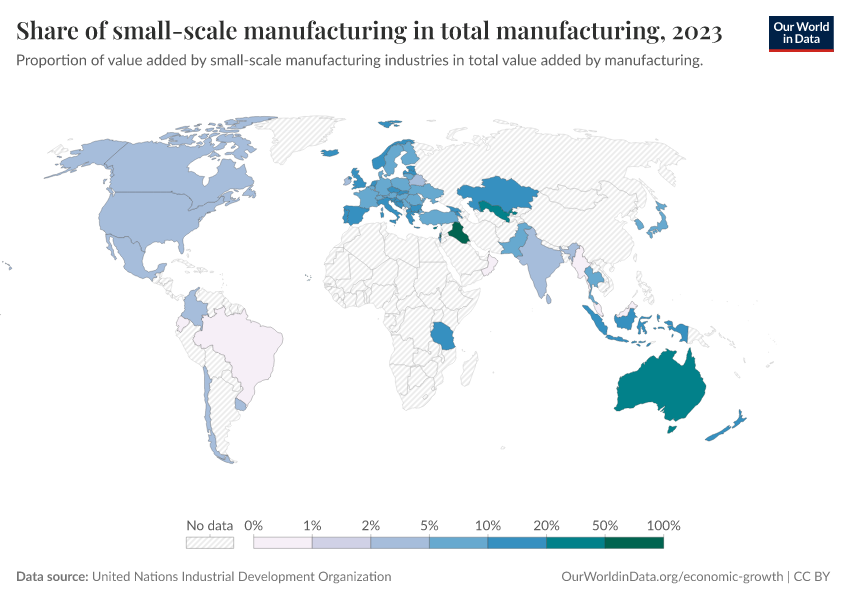 “Data Page: Share of small-scale manufacturing in total manufacturing”, part of the following publication: Max Roser, Bertha Rohenkohl, Pablo Arriagada, Joe Hasell, Hannah Ritchie, and Esteban Ortiz-Ospina (2023) - “Economic Growth”. Data adapted from United Nations Industrial Development Organization. Retrieved from https://tag-updates.owid.pages.dev:8789/20251121-151713/grapher/small-scale-industries-share.html [online resource] (archived on November 21, 2025).How to cite this data