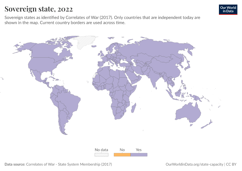 “Data Page: Sovereign state”, part of the following publication: Bastian Herre and Pablo Arriagada (2023) - “State Capacity”. Data adapted from Correlates of War. Retrieved from https://tag-updates.owid.pages.dev:8789/20260224-080822/grapher/sovereign-state-cow.html [online resource] (archived on February 24, 2026).How to cite this data