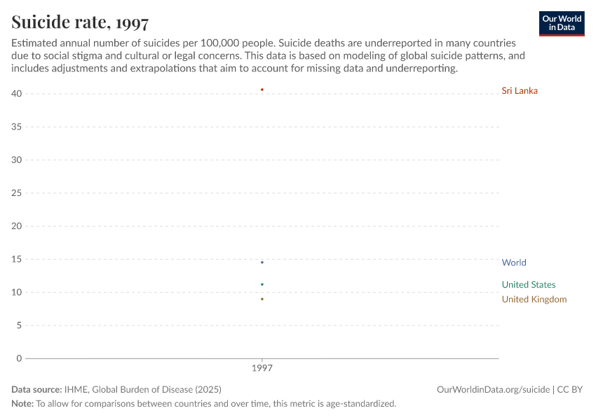 “Data Page: Suicide rate”, part of the following publication: Esteban Ortiz-Ospina and Max Roser (2016) - “Global Health”. Data adapted from IHME, Global Burden of Disease. Retrieved from https://tag-updates.owid.pages.dev:8789/20260211-173942/grapher/suicide-death-rates.html [online resource] (archived on February 11, 2026).How to cite this data