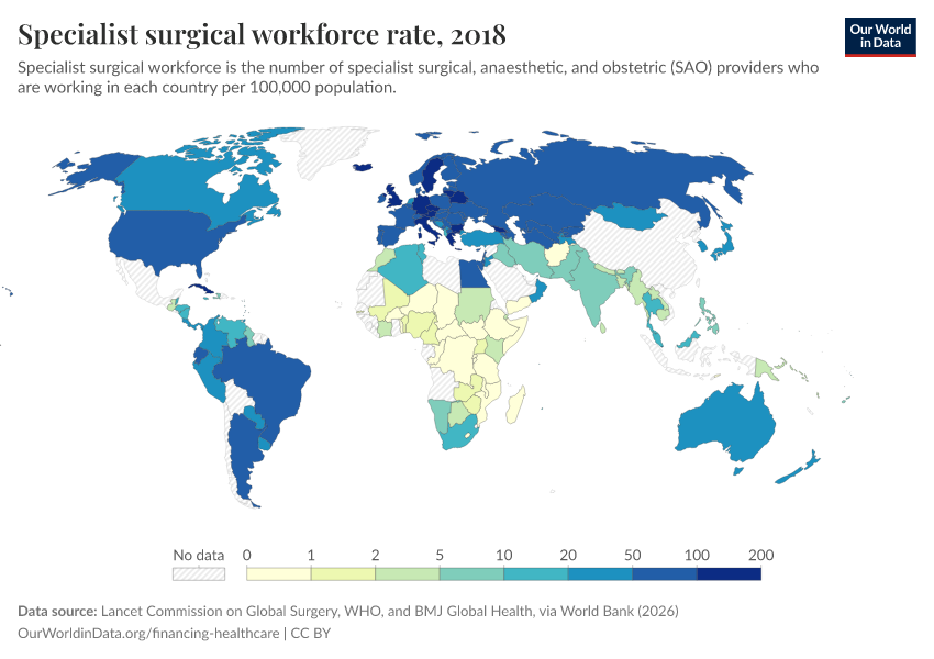 “Data Page: Specialist surgical workforce rate”. Our World in Data (2026). Data adapted from Lancet Commission on Global Surgery, WHO, and BMJ Global Health, via World Bank. Retrieved from https://tag-updates.owid.pages.dev:8789/20260202-181317/grapher/surgeons-per-100000.html [online resource] (archived on February 2, 2026).How to cite this data