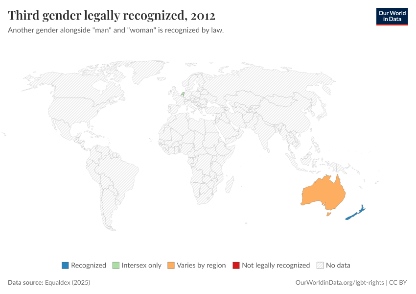 “Data Page: Third gender legally recognized”, part of the following publication: Bastian Herre and Pablo Arriagada (2023) - “LGBT+ Rights”. Data adapted from Equaldex. Retrieved from https://tag-updates.owid.pages.dev:8789/20250909-093708/grapher/third-gender-recognition-equaldex.html [online resource] (archived on September 9, 2025).How to cite this data