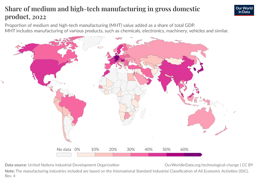 “Data Page: Share of medium and high-tech manufacturing in gross domestic product”, part of the following publication: Max Roser, Bertha Rohenkohl, Pablo Arriagada, Joe Hasell, Hannah Ritchie, and Esteban Ortiz-Ospina (2023) - “Economic Growth”. Data adapted from United Nations Industrial Development Organization. Retrieved from https://tag-updates.owid.pages.dev:8789/20260130-180113/grapher/total-manufacturing-value-added-from-high-tech.html [online resource] (archived on January 30, 2026).How to cite this data