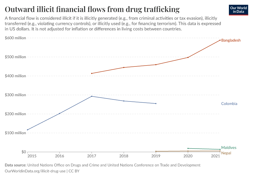 United Nations Office on Drugs and Crime and United Nations Conference on Trade and Development – with minor processing by Our World in Data. “Outward illicit financial flows from drug trafficking” [dataset]. United Nations Office on Drugs and Crime and United Nations Conference on Trade and Development, “Data from multiple sources” [original data]. Retrieved February 27, 2026 from https://tag-updates.owid.pages.dev:8789/20251120-211749/grapher/total-outward-financial-flows-from-drug-trafficking.html (archived on November 20, 2025).