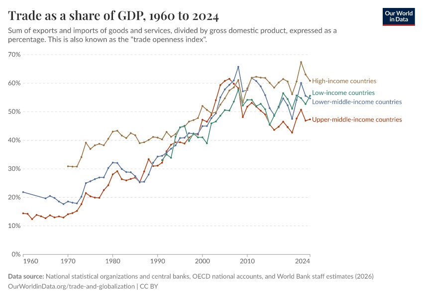 National statistical organizations and central banks, OECD national accounts, and World Bank staff estimates (2026) – processed by Our World in Data. “Trade as a share of GDP” [dataset]. National statistical organizations and central banks, OECD national accounts, and World Bank staff estimates, “World Development Indicators 125” [original data]. Retrieved February 27, 2026 from https://tag-updates.owid.pages.dev:8789/20260225-205642/grapher/trade-as-share-of-gdp.html (archived on February 25, 2026).