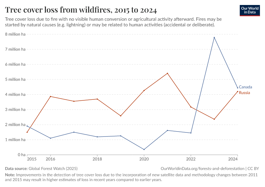 Global Forest Watch (2025) – with major processing by Our World in Data. “Tree cover loss from wildfires” [dataset]. Global Forest Watch, “Tree Cover Loss by Dominant Driver” [original data]. Retrieved February 27, 2026 from https://tag-updates.owid.pages.dev:8789/20260119-065148/grapher/tree-cover-loss-from-wildfires.html (archived on January 19, 2026).