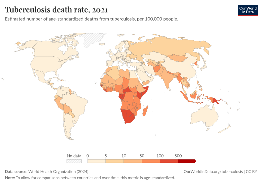 “Data Page: Tuberculosis death rate”, part of the following publication: Esteban Ortiz-Ospina and Max Roser (2016) - “Global Health”. Data adapted from World Health Organization. Retrieved from https://tag-updates.owid.pages.dev:8789/20250909-093708/grapher/tuberculosis-death-rate-age-standardized.html [online resource] (archived on September 9, 2025).How to cite this data