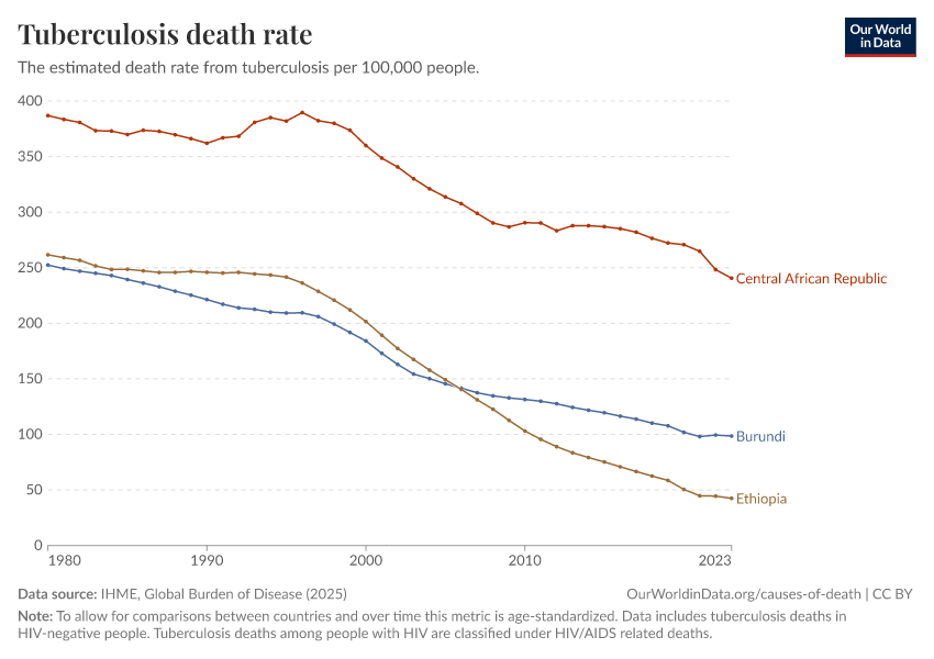 “Data Page: Tuberculosis death rate”, part of the following publication: Esteban Ortiz-Ospina and Max Roser (2016) - “Global Health”. Data adapted from IHME, Global Burden of Disease. Retrieved from https://tag-updates.owid.pages.dev:8789/20260211-174736/grapher/tuberculosis-death-rates.html [online resource] (archived on February 11, 2026).How to cite this data