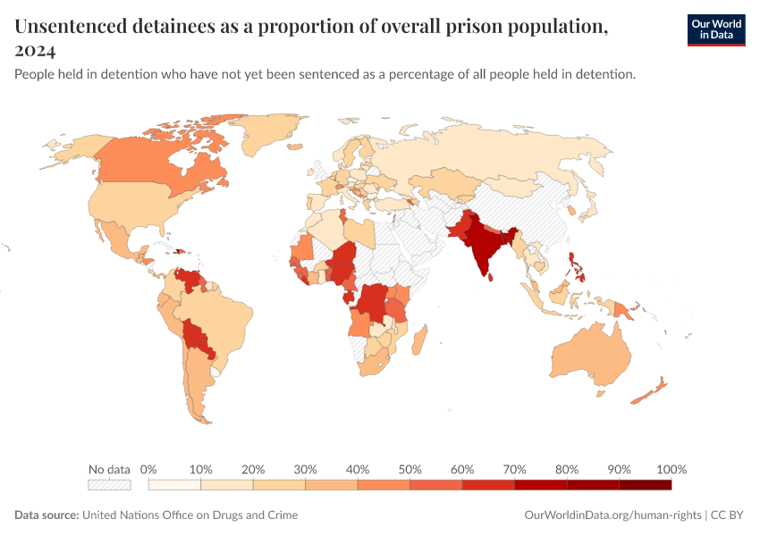 United Nations Office on Drugs and Crime – with minor processing by Our World in Data. “Unsentenced detainees as a proportion of overall prison population” [dataset]. United Nations Office on Drugs and Crime, “UNODC calculations based on national data” [original data]. Retrieved February 27, 2026 from https://tag-updates.owid.pages.dev:8789/20260130-180113/grapher/unsentenced-detainees-as-proportion-of-prison-population.html (archived on January 30, 2026).