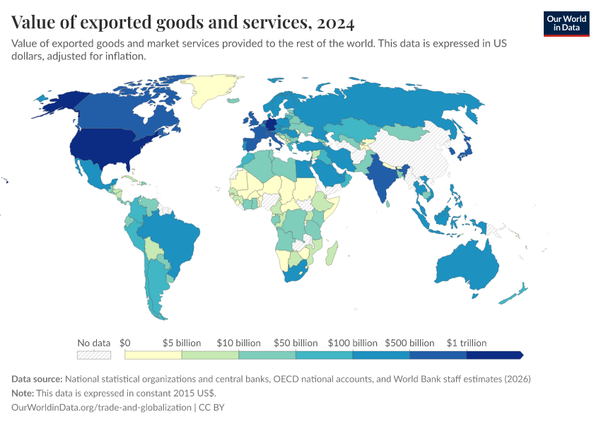 “Data Page: Value of exported goods and services”. Our World in Data (2026). Data adapted from National statistical organizations and central banks, OECD national accounts, and World Bank staff estimates. Retrieved from https://tag-updates.owid.pages.dev:8789/20260202-181317/grapher/value-of-exported-goods-and-services.html [online resource] (archived on February 2, 2026).How to cite this data