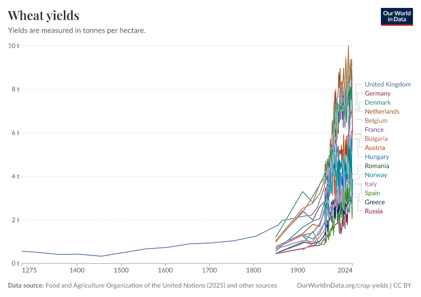 “Data Page: Wheat yields”, part of the following publication: Hannah Ritchie, Pablo Rosado, and Max Roser (2022) - “Crop Yields”. Data adapted from Food and Agriculture Organization of the United Nations, Broadberry et al., Brassley, Bayliss-Smith & Wanmali. Retrieved from https://tag-updates.owid.pages.dev:8789/20260116-143329/grapher/wheat-yields.html [online resource] (archived on January 16, 2026).How to cite this data