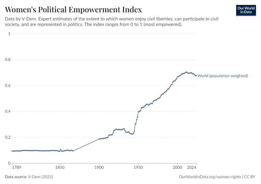 “Data Page: Women's political empowerment index”, part of the following publication: Bastian Herre, Lucas Rodés-Guirao, and Esteban Ortiz-Ospina (2013) - “Democracy”. Data adapted from V-Dem. Retrieved from https://tag-updates.owid.pages.dev:8789/20260119-070102/grapher/women-political-empowerment-index.html [online resource] (archived on January 19, 2026).