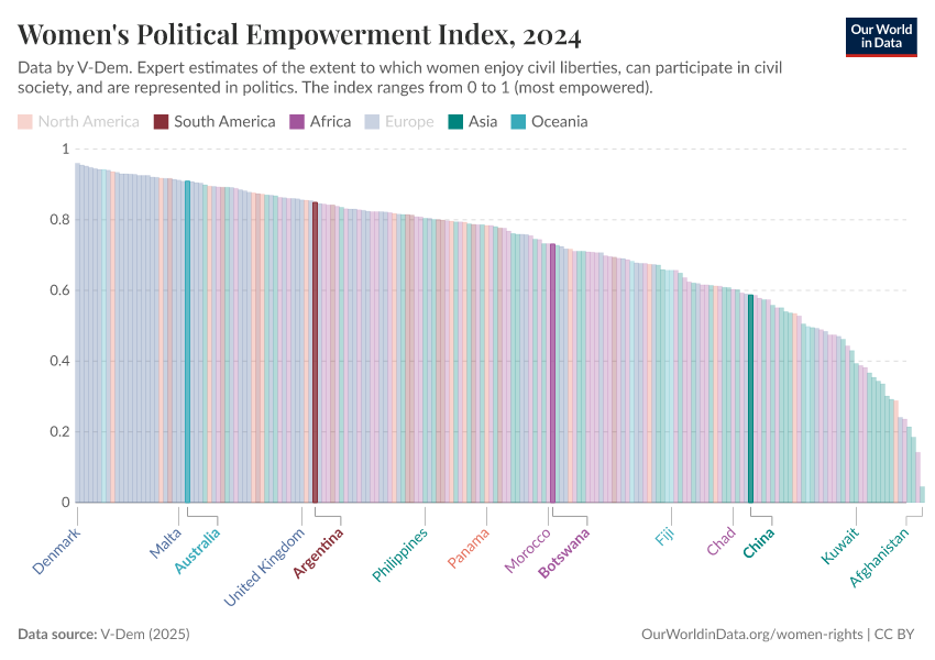 V-Dem (2025) – processed by Our World in Data. “Women's political empowerment index – V-Dem” [dataset]. V-Dem, “Democracy report v15” [original data]. Retrieved February 27, 2026 from https://tag-updates.owid.pages.dev:8789/20260119-070102/grapher/women-political-empowerment-index.html (archived on January 19, 2026).