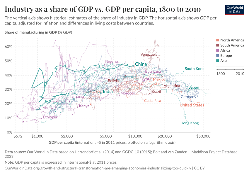 One way to study the process of “structural transformation” across countries is to track how employment changes across sectors in the economy. The below chart does this, plotting the share of industry in total employment (vertical axis) against GDP per head (horizontal axis). This graph is a “connected scatter plot” — each line shows the trajectory that a country followed over time along these two dimensions. Data is available for a selection of more than 40 countries, across all continents.