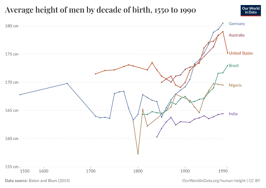 Over the last two millennia, human height, based on skeletal remains, has stayed fairly steady, oscillating around 170cm. With the onset of modernity, we see a massive spike in heights in the developed world.