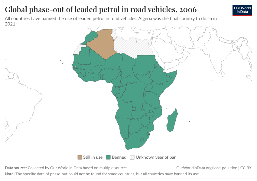 It took long to react, but once the evidence was there and the first country banned it is staggering how quickly some of this progress was made. In 2002, the United Nations Environment Programme (UNEP) launched a programme to eliminate leaded gasoline in road vehicles globally.5 In the map below we see the status of leaded gasoline in Sub-Saharan Africa in 2002. It was still in use in nearly every country. By 2006, it had been banned everywhere in the region. Within only a few years it had been completely eliminated.