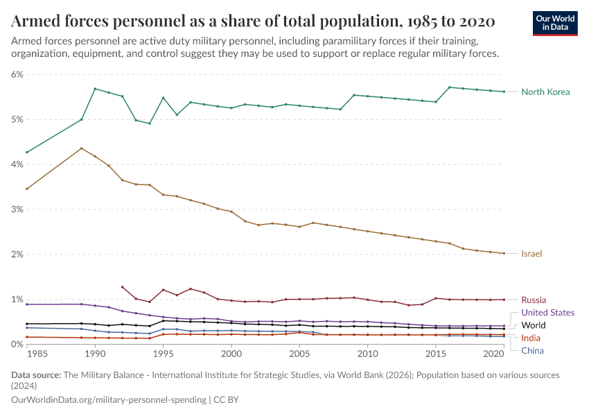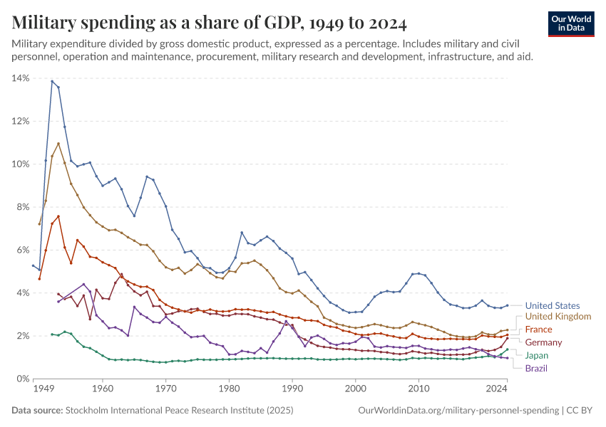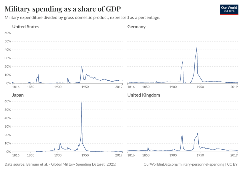Esteban Ortiz-Ospina (2018) - “Long-run trends in military spending and personnel: four key facts from new data” Published online at OurWorldinData.org. Retrieved from: 'https://tag-updates.owid.pages.dev:8789/20260202-181317/military-long-run-spending-perspective.html' [Online Resource] (archived on February 2, 2026).BibTeX citation