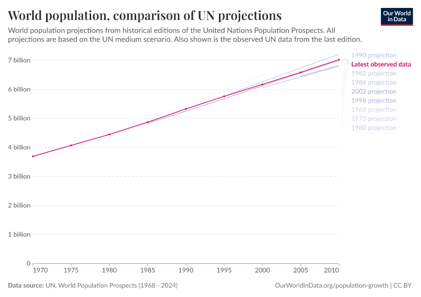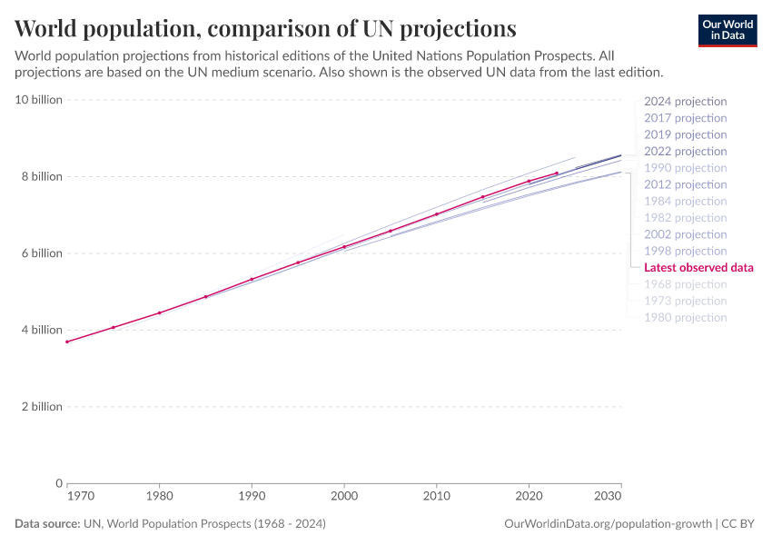 Hannah Ritchie (2023) - “The UN has made population projections for more than 50 years – how accurate have they been?” Published online at OurWorldinData.org. Retrieved from: 'https://tag-updates.owid.pages.dev:8789/20251125-173858/population-projections.html' [Online Resource] (archived on November 25, 2025).BibTeX citation