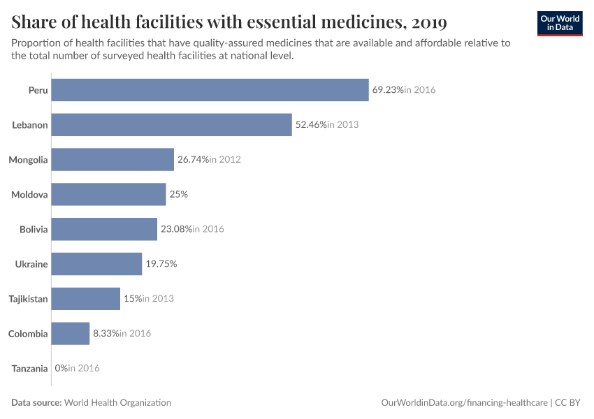 The list of 32 essential medicines used in calculation is from the 2017 Model List of Essential Medicines from the WHO Expert Committee on Selection and Use of Essential Medicines, which updates its list of essential medicines every two years. Availability and affordability of specific medicines are weighted in the overall calculation based on the regional burden of disease.