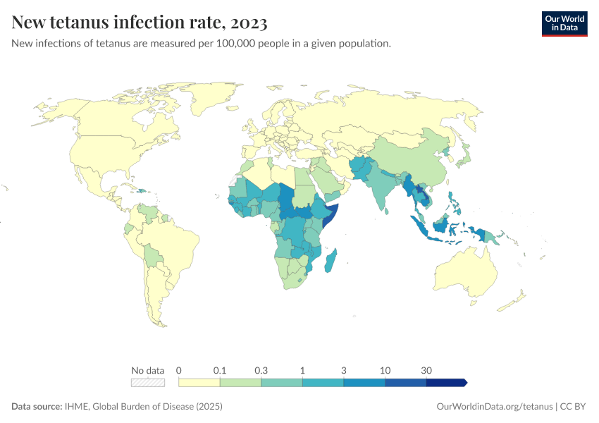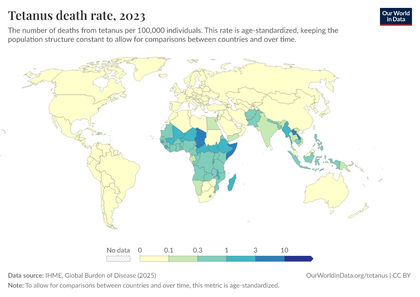 Hannah Behrens, Sophie Ochmann, Bernadeta Dadonaite, and Max Roser (2019) - “Tetanus” Published online at OurWorldinData.org. Retrieved from: 'https://tag-updates.owid.pages.dev/tetanus' [Online Resource]BibTeX citation