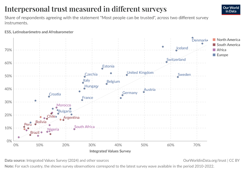 Esteban Ortiz-Ospina, Max Roser, and Pablo Arriagada (2016) - “Trust” Published online at OurWorldinData.org. Retrieved from: 'https://tag-updates.owid.pages.dev/trust' [Online Resource]BibTeX citation