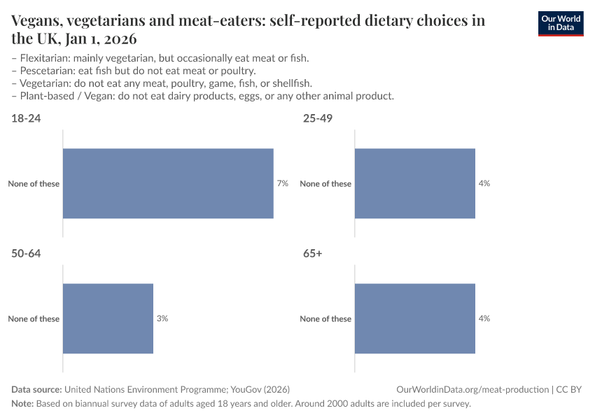 Edouard Mathieu and Hannah Ritchie (2022) - “What share of people say they are vegetarian, vegan, or flexitarian?” Published online at OurWorldinData.org. Retrieved from: 'https://tag-updates.owid.pages.dev:8789/20260202-091452/vegetarian-vegan.html' [Online Resource] (archived on February 2, 2026).BibTeX citation