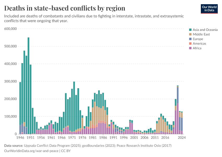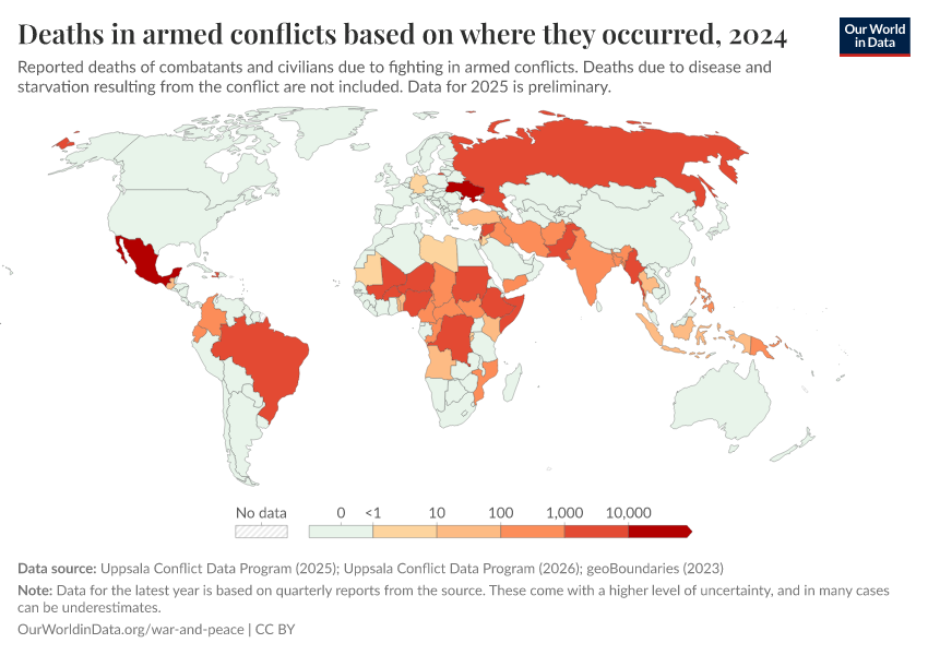 Bastian Herre, Lucas Rodés-Guirao, and Max Roser (2024) - “War and Peace” Published online at OurWorldinData.org. Retrieved from: 'https://tag-updates.owid.pages.dev/war-and-peace' [Online Resource]BibTeX citation